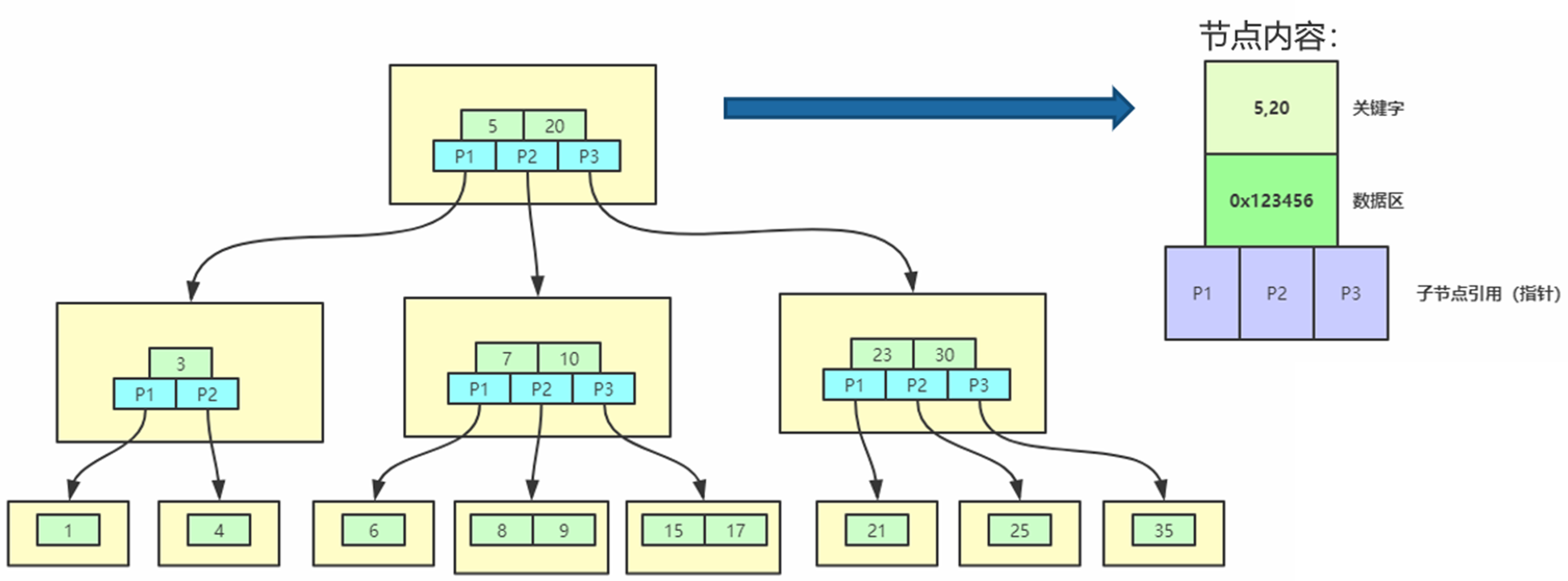 B树与B+树的差别是,B树的非叶子节点也需要存放数据,下图是B树