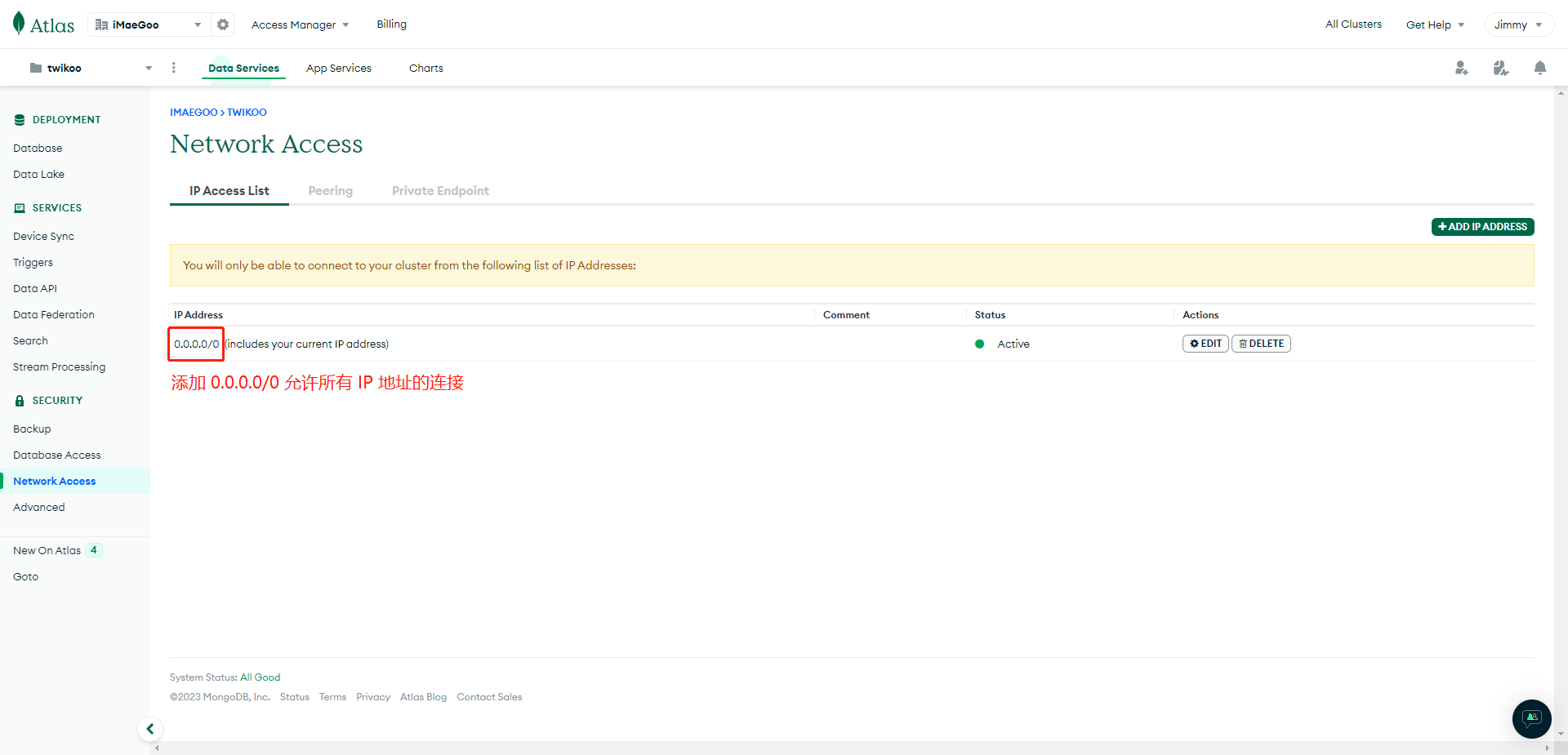 4.在 Network Access 页面点击 Add IP Address 添加网络白名单。因为 Vercel / Netlify / Lambda 的出口地址不固定,因此 Access List Entry 输入 0.0.0.0/0(允许所有 IP 地址的连接)即可。如果 Twikoo 部署在自己的服务器上,这里可以填入固定 IP 地址。点击 Confirm 保存